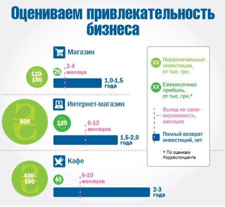Окупність таких проектів складає від чотирьох місяців до року. Причому бізнесмен-початківець обов'язково повинен мати фінансову "подушку".