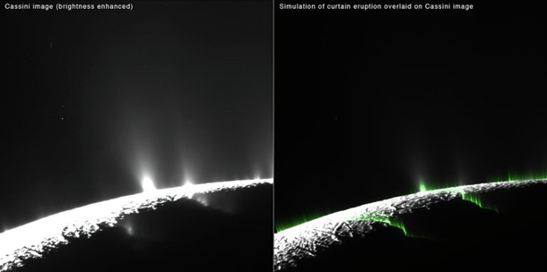 У 2005 році Cassini виявив на Енцеладі струмені з частинок водяного льоду і пари, які викидаються в космічний простір з паралельних тріщин поблизу південного полюса - так званих "тигрових смуг". Це відкриття поставило перед вченими питання про джерело цієї пари і льоду.