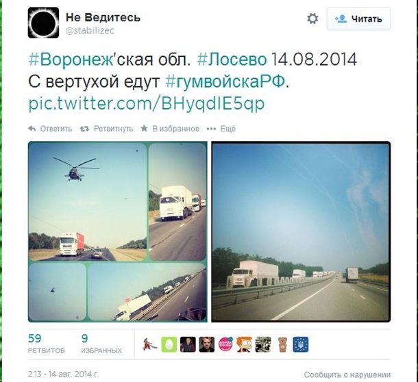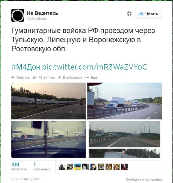 Як повідомляють у соцмережі Twitter, гуманітарний конвой у Ростовську область прибуде через Тульську, Липецьку і Воронезьку області Росії.