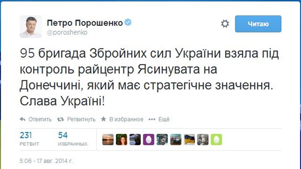 "95 бригада Збройних сил України взяла під контроль райцентр Ясинувата Донецької області", - написав Порошенко.