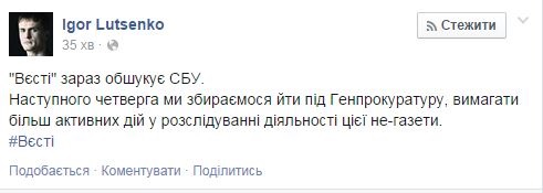"Вести зараз обшукує СБУ. Наступного четверга ми збираємося йти під Генпрокуратуру, вимагати більш активних дій у розслідуванні діяльності цієї НЕ-газети", - написав Луценко.