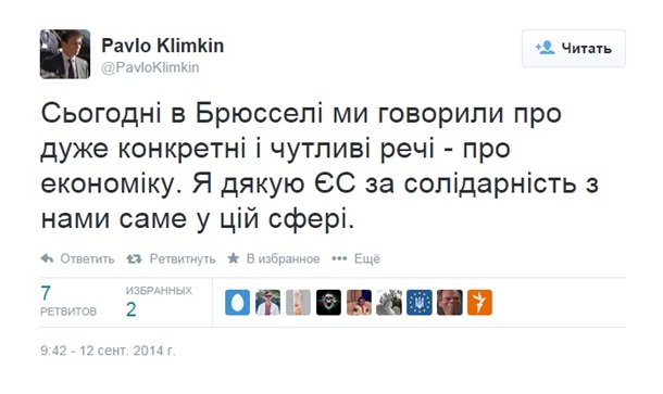 У Брюсселі сьогодні, 12 вересня, вдбулися тристоронні консультації Україна-Росія-Європейський Союз, під час яких знайдене рішення, яке зробить можливою реалізацію Угоди про асоціацію між Україною та ЄС. Про це заявив міністр закордонних справ України Павло Клімкін після завершення тристоронніх переговорів.