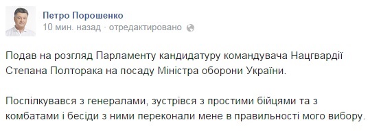 У свою чергу сам Порошенко на своїй сторінці у Facebook зазначає, що робить правильний вибір. "Представив на розгляд парламенту кандидатуру командуючого Нацгвардії Степана Полторака на посаду міністра оборони України. Я поспілкувався з генералами, зустрівся з простими бійцями, з комбатами. Бесіди з ними переконали мене в правильності мого вибору", - написав Порошенко.