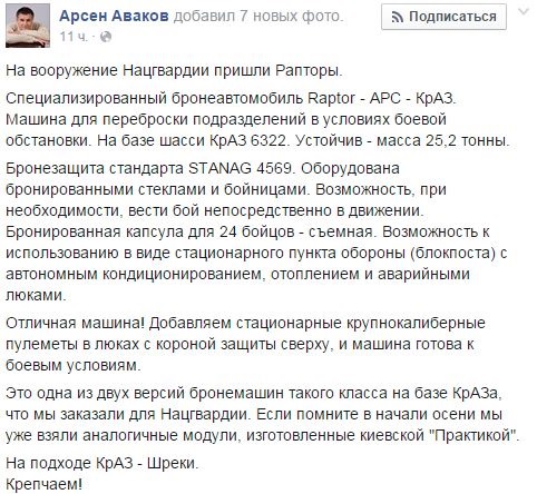 Нацгвардія України отримала на озброєння спеціалізовані бронеавтомобілі Raptor на базі КрАЗ, повідомив глава МВС Арсен Аваков на своїй сторінці у Facebook.