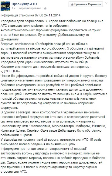 Згідно з інформацією, протягом доби українські силовики втратили трьох бійців. "Каменем спотикання для терористів залишається аеропорт "Донецьк". Члени бандформувань і російські найманці наполегливо ігнорують безпеку цивільного населення зони проведення антитерористичної операції. Бойовики самопроголошених республік і російські соратники продовжують тактику використання "живого щита" для досягнення власних цілей. Обстріл по постах і позиціях сил АТО здійснюються з позицій, обладнаних посеред житлових кварталів населених пунктів, що перебувають під контролем незаконних збройних формувань", - зазначили в повідомленні прес-центру операції.
