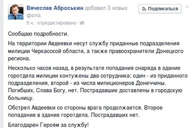 "Кілька годин тому внаслідок влучення снаряда в будівлю міськвідділу міліції контужені два співробітники", - написав Аброськін.