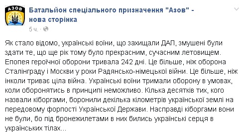 "Як стало відомо, українські воїни, які захищали ДАП, змушені були здати те, що ще рік тому було прекрасним, сучасним аеропортом. Епопея героїчної оборони тривала 242 дні", - йдеться в повідомленні.