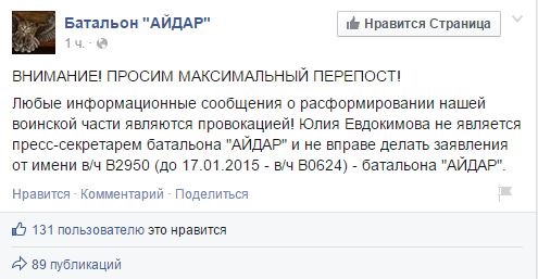 "Будь-які інформаційні повідомлення про розформування нашої військової частини є провокацією! Юлія Євдокимова не є прес-секретарем батальйону Айдар і не вправі робити заяви від імені в/ч В2950 (до 17.01.2015 - в/ч В0624) - батальйону Айдар", - сказано в повідомленні.