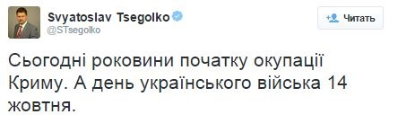 "Сьогодні річниця початку окупації Криму. А день українського війська 14 жовтня", - написав прес-секретар Порошенка Святослав Цеголко.