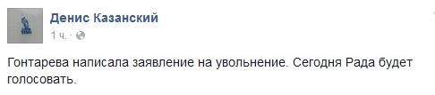 "Гонтарева написала заяву на звільнення. Сьогодні Рада буде голосувати", - написав він на своїй сторінці у Facebook.