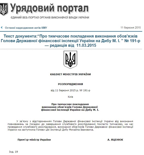 Згідно з документом, Диба призначений керівником Держфінінспекції на час проведення службового розслідування стосовно голови Держфінінспекції – Миколи Гордієнка.