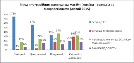 У регіональному розрізі, проєвропейські настрої переважають на заході і в центрі країни: курс на вступ у ЄС підтримують 75% жителів західних областей і 57% жителів центру. На півдні та сході більшість воліли б, щоб Україна зберігала нейтралітет і не входила ні в ЄС, ні в Митний союз - такої думки в південному регіоні дотримуються 37%, на сході - 32%.