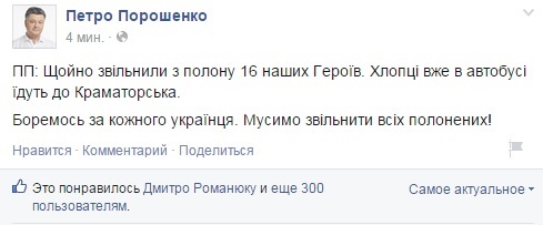 "Щойно звільнили з полону 16 наших героїв. Хлопці вже в автобусі їдуть до Краматорська. Боремося за кожен українця!" - Йдеться в повідомленні.