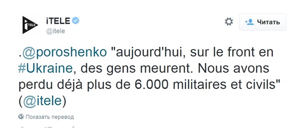 Кількість жертв конфлікту на Донбасі вже перевищила 6 тисяч. Про це заявив Президент України Петро Порошенко в інтерв'ю французькому телеканалу iTELE, сказано на сторінці мовника в Twitter.