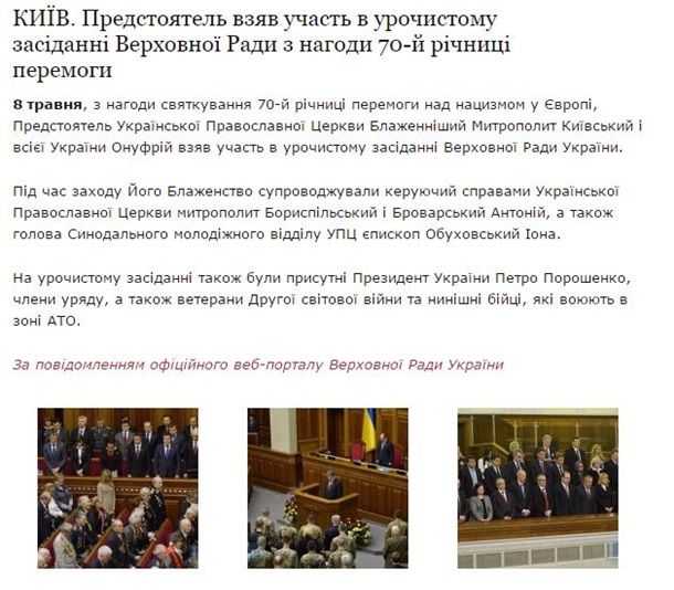 УПЦ МП оприлюднила на своєму сайті звіт про участь предстоятеля митрополита Онуфрія в урочистому засіданні Ради з нагоди 70-ї річниці перемоги у Другій світовій війні.
