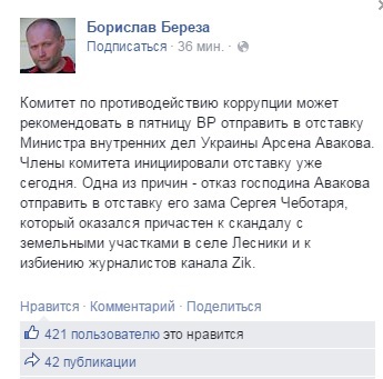 "Члени комітету ініціювали відставку вже сьогодні. Одна з причин - відмова пана Авакова відправити у відставку його зама Сергія Чеботаря, який виявився причетним до скандалу з земельними ділянками в селі Лісники і до побиття журналістів каналу Zik", - написав він.