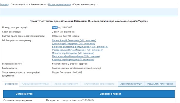 Авторами проекту постанови про звільнення Квіташвілі виступили сім депутатів