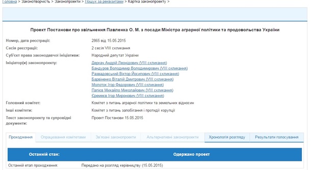 Ті ж депутати зареєстрували проект постанови №2865 про звільнення Олексія Павленка з посади міністра аграрної політики і продовольства.