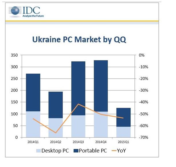 У першому кварталі 2015 року український ринок персональних комп'ютерів (ПК) скоротився на 53,6%. Про це свідчать результати дослідження компанії IDC.