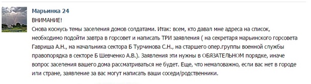 Зараз місцева влада просить жителів при виявленні фактів заняття будинків без згоди власників службовцями ЗСУ звертатися із заявами в Мар'їнську міську раду і до керівництва служби військового правопорядку в секторі Б.