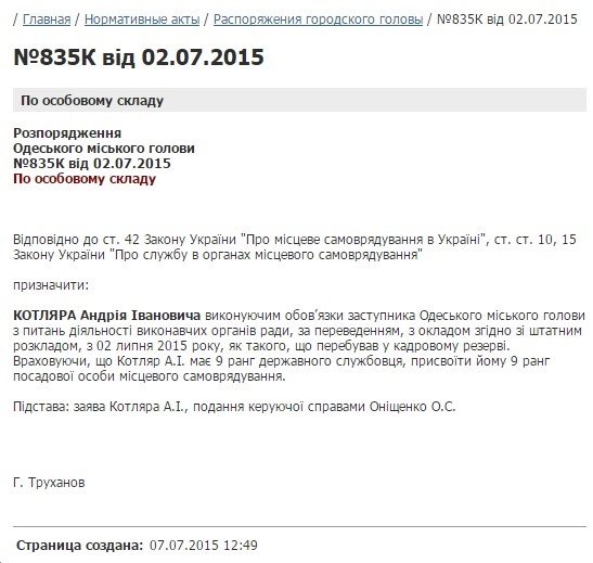 "Призначити Котляра Андрія Івановича виконуючим обов'язки заступника Одеського міського голови з питань діяльності виконавчих органів ради, за переведенням", - сказано в документі.