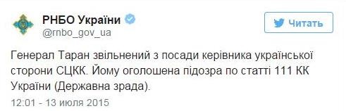 "Генерал Таран звільнений з посади керівника української сторони СЦКК. Йому оголошено підозру за статтею 111 КК України (Державна зрада)", - йдеться в повідомленні.