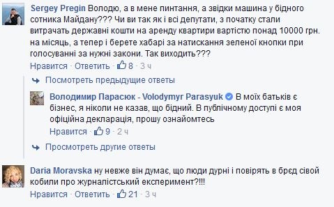 Разом з тим, користувачі обурюються, звідки у Парасюка дорогий автомобіль Skoda Superb. Депутат відповів на це, що він ніколи не говорив, що він бідний, а у його батьків є свій бізнес.