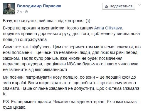Він заявив, що зробив це спеціально. "У рамках журналістського експерименту порушив правила дорожнього руху в Києві. Нова Патрульна поліція Україна відпрацювала на відмінно!", - Написав Парасюк на своїй сторінці в Facebook.