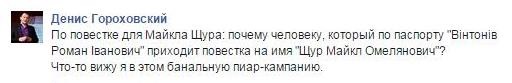 "Щодо повістки для Майкла Щура: чому людині, яка за паспортом "Вінтонів Роман Іванович" приходить повістка на ім'я "Щур Майкл Омелянович"? Щось бачу я в цьому банальну піар-кампанію", - пишуть у соцмережах.