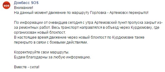 "За інформацією від очевидців, сьогодні з ранку Артемівський пункт пропуску закритий через ремонтні роботи, - зазначено в повідомленні. - Весь транспорт прямував в об'їзд через Курдюмівку, де організований новий блокпост. В даний час рух через нього також перекрито у зв'язку з бойовими діями".