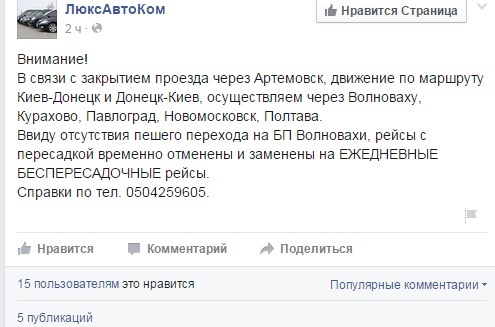 Також про закриття проїзду повідомила на своїй сторінці в Facebook місцева компанія ЛюксАвтоКом. В зв'язку з цим перевізник змінив рух до Києва і назад. Зокрема, тепер замість Артемівська автобуси будуть проїжджати через Волноваху, Курахове, Павлоград, Новомосковськ і Полтаву.