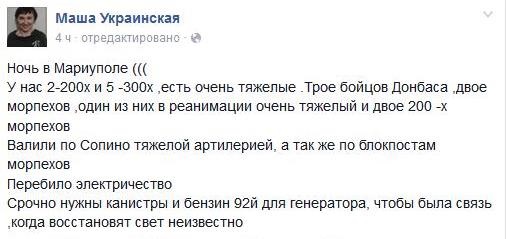 "Троє бійців Донбасу (поранені, - ред.), двоє морпіхів, один з них - у реанімації, дуже важкий. Палили по Сопиному важкою артилерією, а також по блокпостах морпіхів. Перебили електрику", - написала вона на своїй сторінці у Фейсбуку.