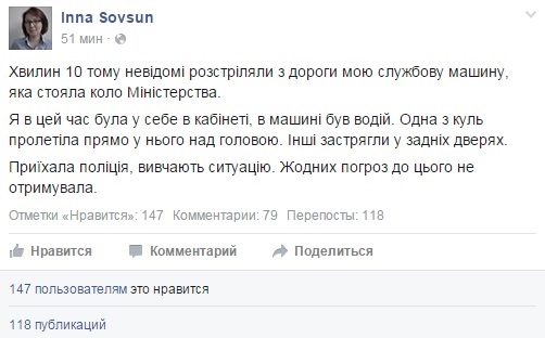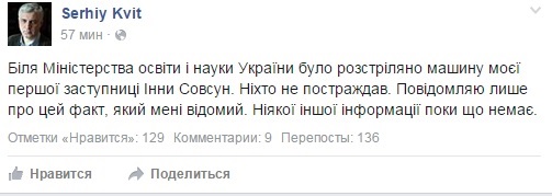 "Біля Міністерства освіти і науки України була розстріляна машина мого першого заступника Інни Совсун. Ніхто не постраждав. Повідомляю тільки про цей факт, який мені відомий. Ніякої іншої інформації поки немає", - написав Квіт.