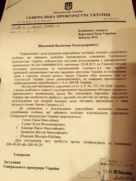 "...Прошу вас повідомити народним депутатам України про необхідність прибути у зручний для них час до органу досудового розслідування для надання свідчень щодо обставин, викладених у заяві міського голови Львова Садового А. І.", - йдеться в документі ГПУ.