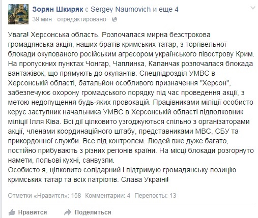 На адміністративному кордоні Херсонської області та анексованого Криму о 12:00 неділі, 20 вересня, стартувала безстрокова громадянська акція кримських татар та громадських активістів по торговому блокуванню півострова. Про це повідомив радник глави МВС України Зорян Шкіряк на своїй сторінці в Facebook в неділю, 20 вересня.