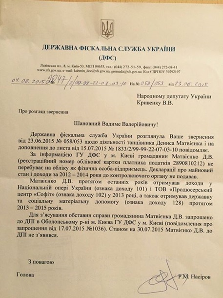 "При цьому 6 листопада в черговий раз (Денис Матвієнко - ред.) не проти заробити під час показу балету в Палаці "Україна"", - пише нардеп, який опублікував довідку ДФС.