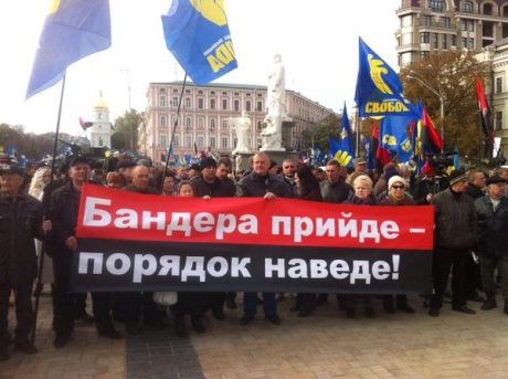 14:00 За даними ЗМІ акція "Свободи", Організації українських націоналістів, Конгресу українських націоналістів і партії "Правий сектор" зібрала близько 2 тисяч людей.