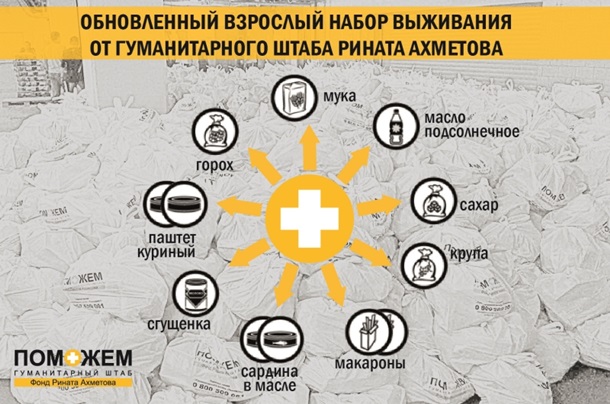 Штаб Ріната Ахметова з вівторка, 20 жовтня, почав видавати оновлені набори виживання, призначені для пільгових категорій мирних жителів Донбасу, в якості гуманітарної допомоги. Як заявила координатор штабу Римма Філь, зміни торкнулися складу продуктового набору.