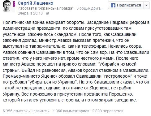 Як повідомляє нардеп від Блоку Петра Порошенка Сергій Лещенко, під час сварки Аваков "звинуватив Саакашвілі в тому, що він злодій", а потім перейшов на крики зі словами: "Забирайся з моєї країни".