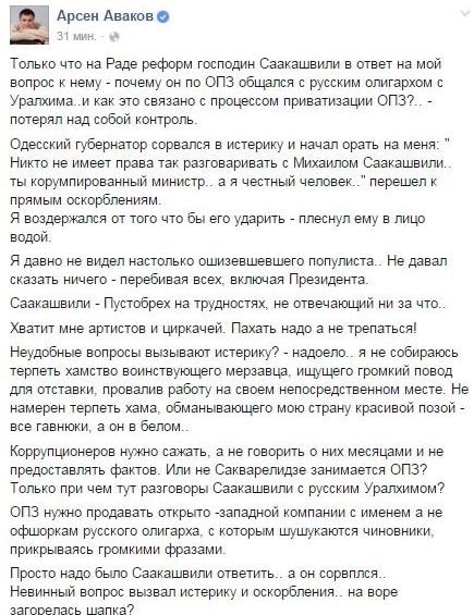 "Щойно на Раді реформ пан Саакашвілі у відповідь на моє запитання до нього - чому він по ОПЗ спілкувався з російським олігархом з Уралхіма ... і як це пов'язано з процесом приватизації ОПЗ ... - втратив над собою контроль ... Я давно не бачив настільки ошизілого популіста .. Не давав сказати нічого - перебиваючи всіх, включаючи президента ... Досить мені артистів і циркачів..", - написав Аваков у Facebook.