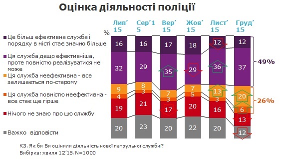 Так, 37% опитаних вважає, що поліція - більш ефективна служба, але вона не може реалізуватися повністю, 20% називає поліцію неефективною службою, з приходом якої ситуація не змінилася.