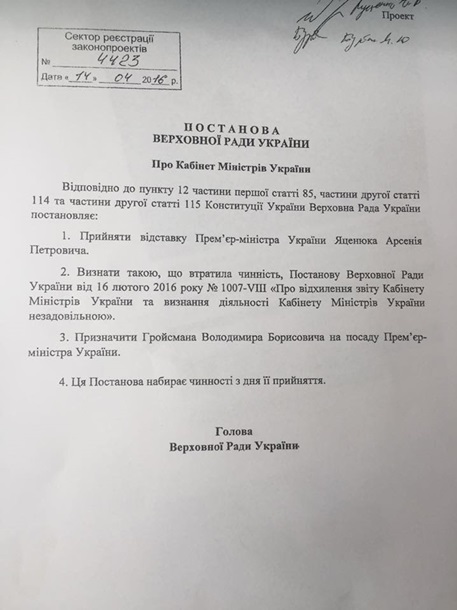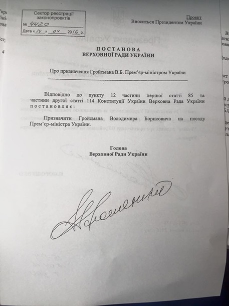 У той же час внесене президентом України Петром Порошенком подання про призначення Гройсмана прем'єр-міністром №4420, згідно з даними сайту ВР, просто "заслухано".