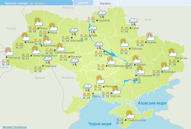 Вночі 30 липня в західних, Житомирській, а вдень місцями в північних, Вінницькій, Черкаській областях і в Карпатському регіоні очікується короткочасний дощ, гроза. На решті території України в суботу буде без опадів.