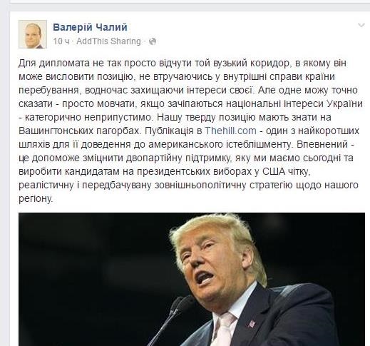 Коментарі кандидата в президенти Сполучених Штатів від Республіканської партії Дональда Трампа щодо України і Криму надсилають світу неправильний сигнал. Про це написав посол України в США Валерій Чалий в колонці для видання The Hill.
