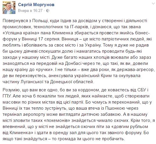"Я б дуже не радив би цьому діячеві (Клименку - ред.) спокушати долю і проводити будь-які заходи ... У нашому місті знайдеться чимало охочих зловити таких "покемонів"", - написав Моргунов.