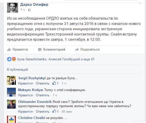 "Через недотримання ОРДЛО взятих на себе зобов'язань з припинення вогню з півночі 31 серпня 2016 в зв'язку з початком нового навчального року, українська сторона ініціювала екстрену відеоконференцію Тристоронньої контактної групи. Скайп-зустріч пропонується провести завтра, 1 вересня, о 12:00" , - написала вона в своєму Facebook.