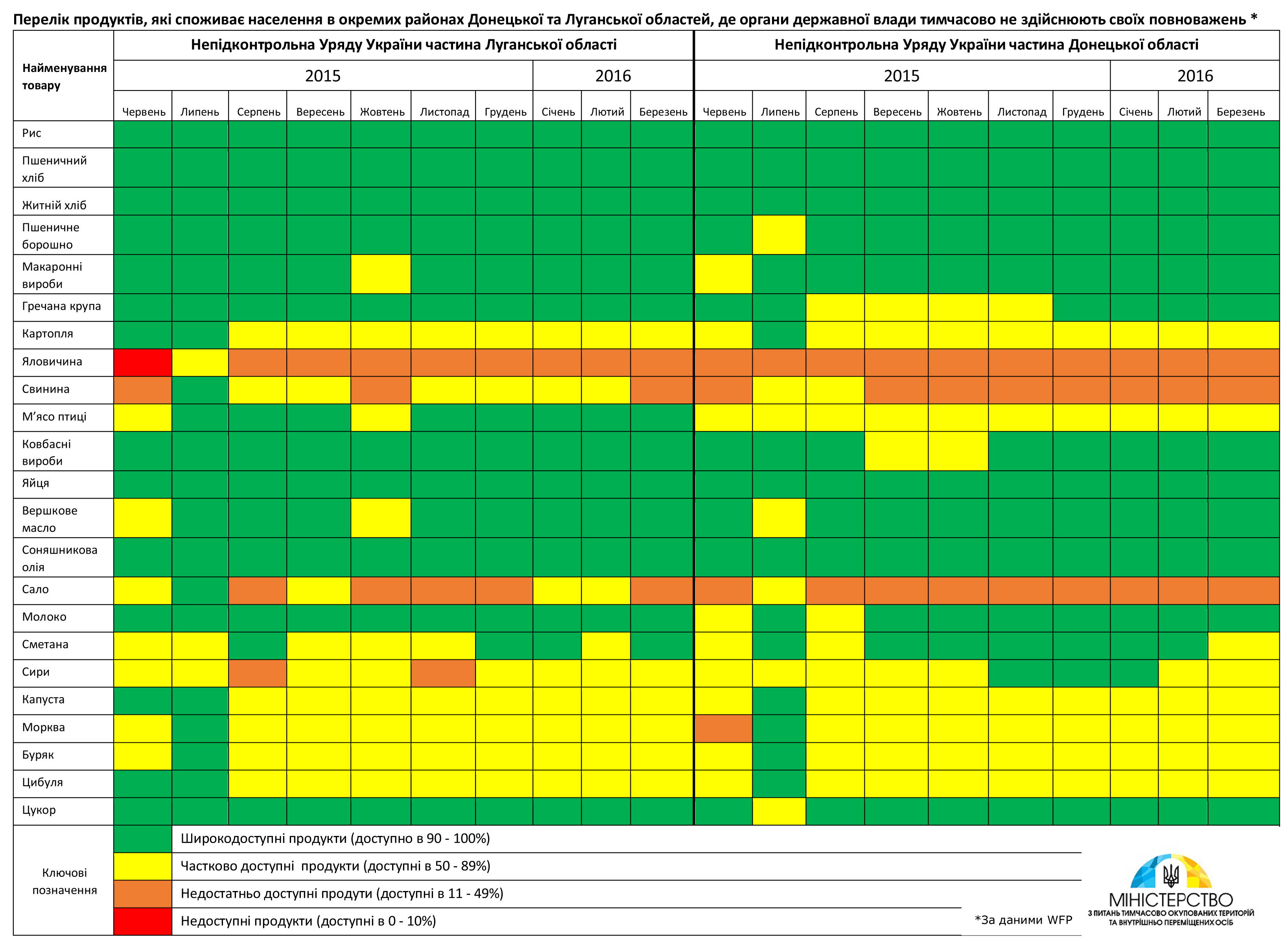 Громадяни, які живуть уздовж лінії розмежування на тимчасово непідконтрольних територіях, мають безперешкодний доступ до таких продовольчих товарів: рис, гречка, хліб, молочні продукти, а також соняшникова олія, цукор, ковбаси.