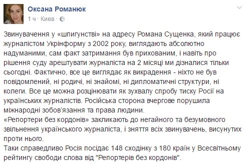 "Оскільки звинувачення в "шпигунстві" на адресу Романа Сущенка ... виглядають абсолютно надуманими, сам факт затримання був прихованим, і навіть про рішення суду заарештувати журналіста на два місяці все дізналися тільки сьогодні, це можна розцінювати як нахабну спробу тиску Росії на українських журналістів", - написала Романюк, додавши, що Росія займає 148-е місце з 180 у всесвітньому рейтингу свободи слова.