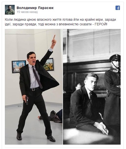 Народний депутат України Володимир Парасюк, коментуючи у себе у Facebook новину про вбивство посла РФ в Туреччині Андрія Карлова, назвав його вбивцю Мевлюта Мерта Алтинташа "справжнім героєм".