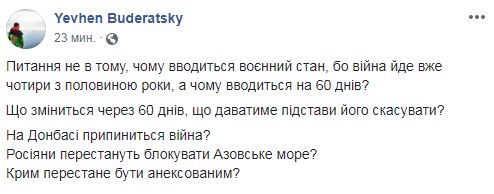 Популярна думка в соціальних мережах. За 60 днів, на які пропонують ввести воєнний стан, нічого в країні не зміниться. Навіщо тоді вводити його саме зараз?